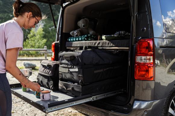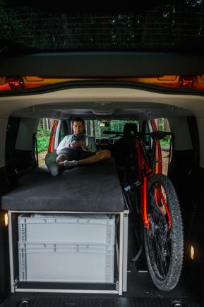 The Biker module is an ideal solution for anyone traveling with a bike or other large sports equipment. It is primarily designed as a single bed, leaving enough space in the vehicle for one or even two bikes. Thanks to the integrated full-extension system, the storage space under the module is efficiently utilized. In just a few minutes, the module can be unfolded from a compact box into a single bed, and if needed, into a full-width double bed. The module requires no modifications to the vehicle interior and is delivered complete with mattresses, securing straps, and a practical bag for mounting hardware.