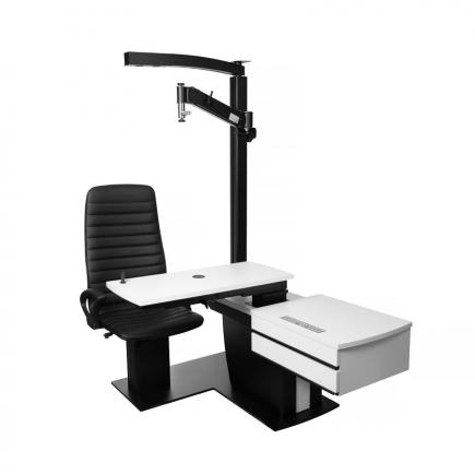 Medical device for professionals || The new Medinstrus DeltaQ ophthalmic unit is an optimally designed refraction unit to have everything at hand during an eye examination. The unit is equipped with an electrically lifted patient chair and an electrically lifted top for two devices and an integrated cabinet with two drawers: one for a set of trial lenses and the other, additional. Countertops and cabinet made of glued wood. The DeltaQ unit is a high-end solution, both for ophthalmology clinics and surgeries, as well as optical salons.