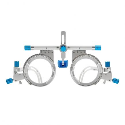 Medical device intended for professionals || The universal HAYNE Original trial frame is made of lightweight material. Designed for 5 pairs of lenses (3 at the front and 2 at the back). Fully adjustable using blue knobs. Equipped with additional knobs for locking the lens axis. Comfortable adjustable temples and plastic lens holders.