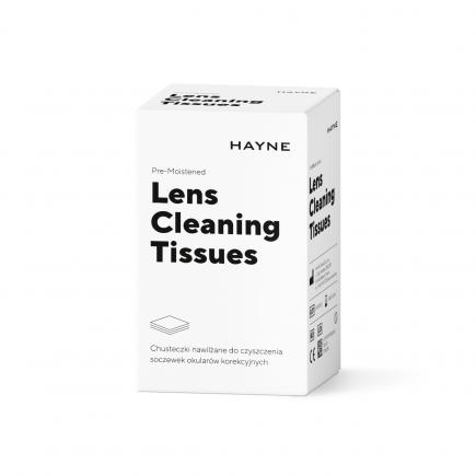PRODUCT DESCRIPTION: The tissues effectively clean even heavily soiled surfaces and help protect them against re-soiling. HAYNE PRE-MOISTENED LENS CLEANING TISSUES do not contain alcohol or ammonia, making them completely safe and suitable for use with all types of coatings. They have antistatic properties and leave no streaks. Neutral, subtle scent. Single-use product – reuse may cause damage/scratching of the cleaned surface. Do not use for cleaning contact lenses.