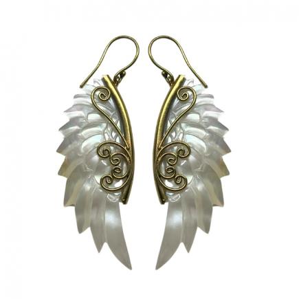 Náušnice andělská křídla Sawan jsou ručně vyrobeny z mušle a mosazi.