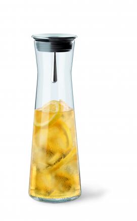 Mit dieser formschönen, zeitlosen Karaffe in Metall-/Kunststoffkombination mit praktischer Verschlußtechnik lassen sich sowohl erfrischende Sommergetränke als auch wohltuende Heißgetränke stilvoll zubereiten, servieren und natürlich genießen. Durch den neu entwickelten Deckel mit Ausgießfunktion werden Ihre Getränke, gerade in der warmen Jahreszeit perfekt vor äußeren Einflüssen, wie umherirrenden Insekten oder herunter fallenden Blättern, geschützt und gleichzeitig bleiben Ihre Zutaten, wie zum Beispiel Eiswürfel, Zitronenscheiben, Minze oder Zimt beim Ausgießen in der Karaffe für unbeschwerten Trinkgenuss. Außerdem setzt die Karaffe durch die farbigen Ausgießer auch schöne dekorative Akzente auf Ihrem gedeckten Tisch. Die Karaffe ist für die Nutzung in der Spülmaschine und dem Kühlschrank geeignet.