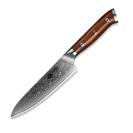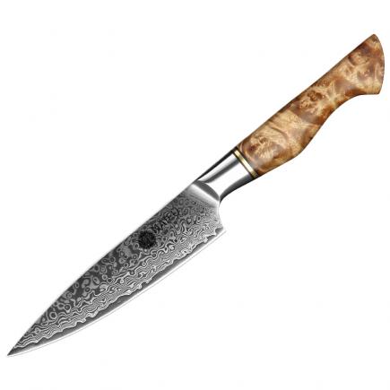 Das 5-Zoll-Universalmesser NAIFU aus Damaststahl mit einer Gesamtlänge von knapp 25 cm. Die Klingenlänge von 13 cm macht es zum perfekten Werkzeug zum Schneiden von Obst, Gemüse und Wurstwaren. Die Klinge mit 67 Schichten Damaststahl und einer Härte von 60 HRC bleibt auch bei täglichem Gebrauch scharf, während der natürliche Holzgriff einen komfortablen und stabilen Halt bietet.